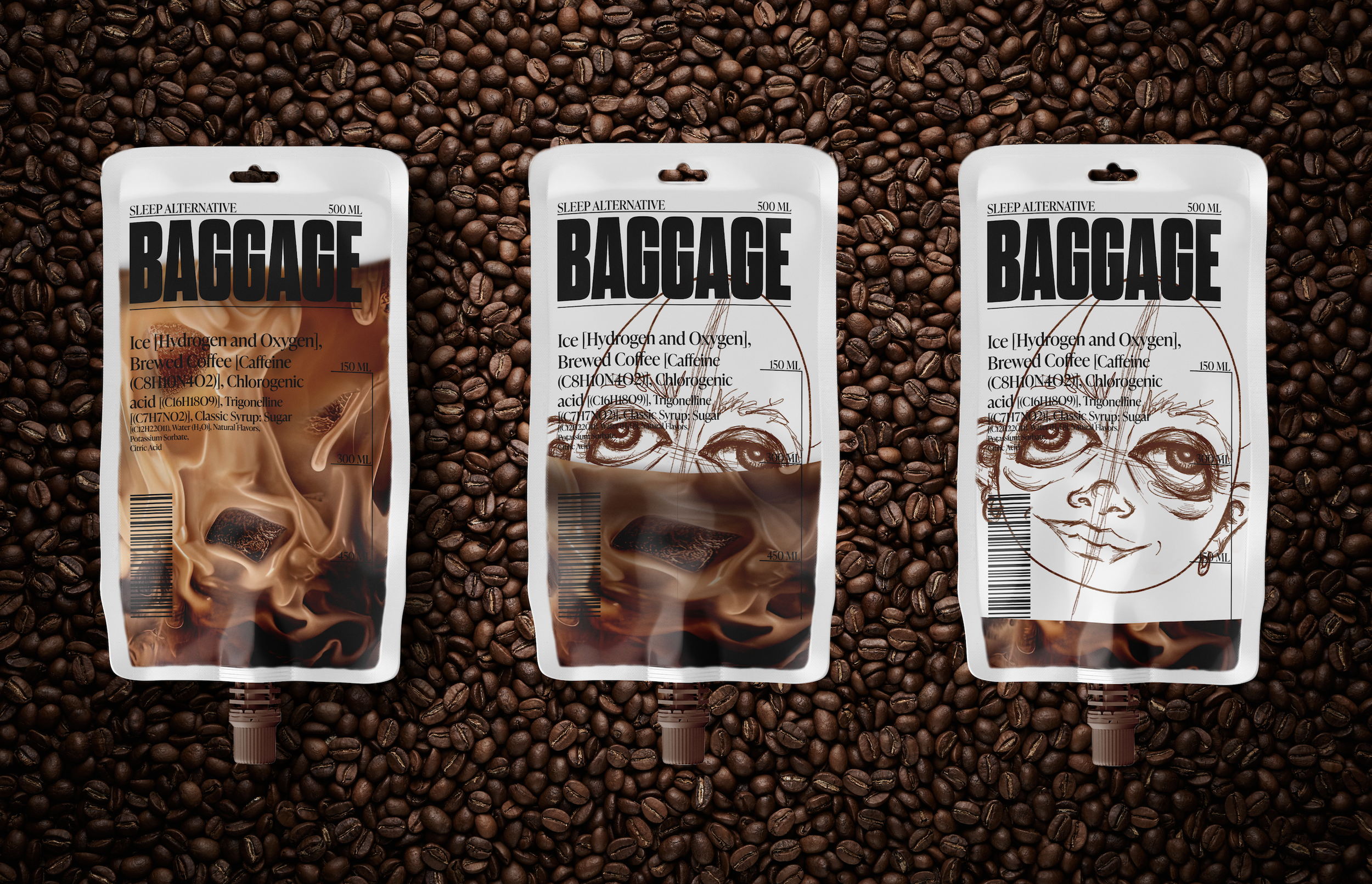 Through its medical aesthetic, Baggage serves as a vehicle for sparking conversations about the absurdities of modern workplace dynamics and the societal pressures driving our collective reliance caffeine.